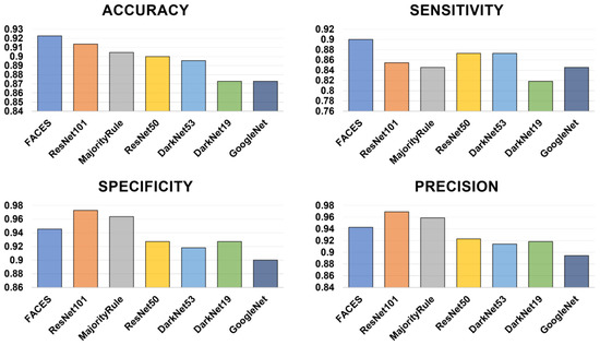We compared the performance of the FACES with that of individual CNN-based models and the majority rule. The results show that FACES displays the best performance, revealing the highest accuracy (92.27%), followed by ResNet-101 (91.36%) and the majority rule (90.45%), as well as the highest sensitivity (0.90), followed by ResNet50 (0.873) and DarkNet53 (0.873) (Figure 9). However, FACES’s specificity (0.945) and precision (0.943) are the third highest, following ResNet101 (0.973 for specificity and 0.969 for precision) and the majority rule (0.964 and 0.959).