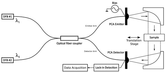 Common THz-FDS is based on beating two optical signals with different wavelengths [22]. Tunable laser sources are used as optical signal sources, as shown in Figure 1. The frequency modulation happens in an optical fiber coupler, where two optical signals are mixed. The resulting optical signal contains THz carrier frequency , estimated as: