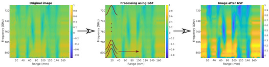 GSF was applied in the second processing stage of the proposed image reconstruction algorithm. The authors in [18] determined that the PCA’s intensity profile can be estimated using the Gauss function. While using the THz-TDS system, THz beam profile modeling was used in [12] to enhance the resolution and contrast of the acquired image. In the acquisition setup shown in Figure 1, the THz beam is directed through a silicon lens and collimated through collimation mirrors. The intensity profile will stay the same after collimation. Therefore, the THz beam will propagate through the sample with a Gauss intensity profile. The empirically determined spotlight’s diameter was 8 mm, while the linear step was set to mm. The intensity profile was modeled using a 1D Gauss function using 8 mm/ mm = 16 samples. As shown in Figure 4, GSF was applied to the samples at the same vertical position in the acquired spectrogram.