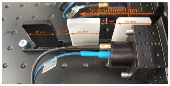 The proposed method for image reconstruction is based on our previous research [17] and presents a combination of full-field imaging and single-point scanning. A linear actuator with small steps is used to move PCAs over the sample, similar to single-point scanning. Because of the relatively large spotlight compared to the translation step, the acquired single trace will overlap with its neighboring traces. If the linear step is much smaller than the spotlight’s radius, and if the spotlight’s intensity profile is known or can be modeled, the neighboring values can be used to determine the pixel value. This is similar to full-field imaging, where techniques such as compressed sensing are used to determine single pixel value. In the proposed image reconstruction method, a linear step determines the image resolution. The setup for image acquisition is presented in Figure 1. THz wave generation and detection was performed using commercially available system TeraScan 1550 from Toptica Photonics, and the LTS300/M linear rail from Thorlabs was used as translation stage. The linear rail’s speed was set to 1 mm/s and the linear rail’s acceleration to 1 mm/s. Step distance of LTS300/M was set to 0.5 mm.
