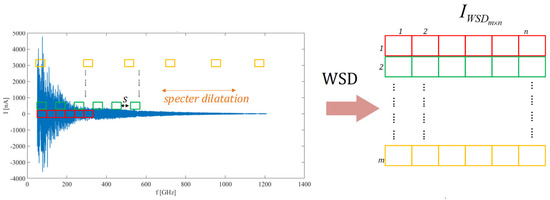 where is the i-th row of the image, is the running index and k is dilation factor. The WSD can also be applied to a down-sampled dataset to lower image resolution and preserve the spectral characteristics of the dataset. Adequately down-sampled data preserves the peak envelope’s shape, and WSD preserves the shape of the envelope in all rows of the image. Those mentioned above confirm that WSD transformation should be more resilient to measurement uncertainties and data misalignment. The WSD data structure is presented in Figure 6. In the given experiment, the presented WSD algorithm focuses on lower frequencies, which have a higher amplitude, therefore, a higher impact on classification. To determine the optimal frequency range, the input series to the WSD algorithm should be normalized. Transmittance T based on Equation (2) was used to normalize the input series.