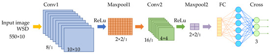 The efficiency of the CNN depends on the prepared training dataset, network structure, and hyperparameter selection [27]. This paper’s single CNN structure was designed for moderate resolution, benefiting from short training time and high classification speed while maintaining high classification accuracy. Figure 7 shows the proposed CNN structure, where Conv, ReLu, Maxpool, FC and Cross are abbreviations for convolution operation, rectified linear activation function, max pooling, fully connected layer and cross-entropy, respectively. The number after the forward slash in Figure 7 represents the stride layer.
