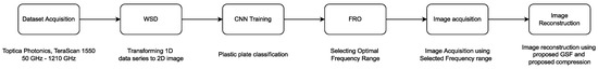 Classification of different materials depends on their spectral characteristics. Each material has its spectral footprints, and this paper aims to detect the intersection of those spectral footprints. The advantage of CNN in the case of classification is recognition robustness, which can mimic the eye’s natural phenomena of cortex vision [25,26]. In the preliminary work [19], the WSD algorithm proved superior to algorithms using 1D THz-FDS data. One of CNN advantages is that the features can be extracted even if they are distributed randomly spatially. As described in Section 2, pseudo random spatial distribution is one of the shortcomings of THz-FDS systems, which is the result of the frequency tuning method.