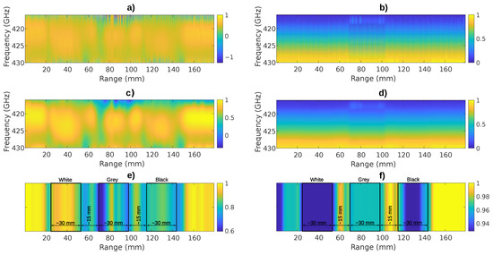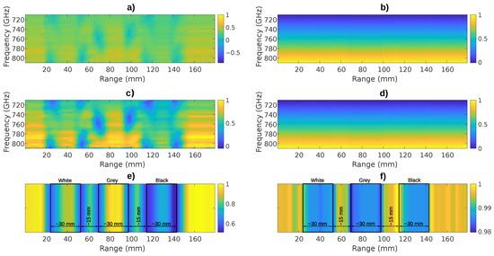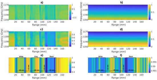 Figure 13 shows the resulting images for measurements in the frequency range between 770 GHz and 810 GHz. Figure 13e,f show a compressed 1D intensity image and compressed 1D phase image, respectively. The plastic plates are distinguishable among them and are clearly distinguishable from the environment. The results in Figure 13 are similar to the results from the reference measurements shown in Figure 14. However, because of the shorter frequency range, some uncertainties are present.