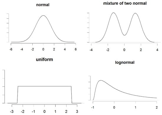 The were generated based on 4 different distributions , normal, mixture of 2 normal distributions, uniform and lognormal [4,27,28], with media 0 and 4 variance values: = 1, 2, 4 and 8 (Figure 1).