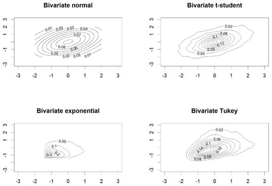 - bivariate Tukey , where parameter controls the amount and direction of asymmetry, while parameter controls the amount of elongation (kurtosis) of the bivariate Tukey distribution [30].
