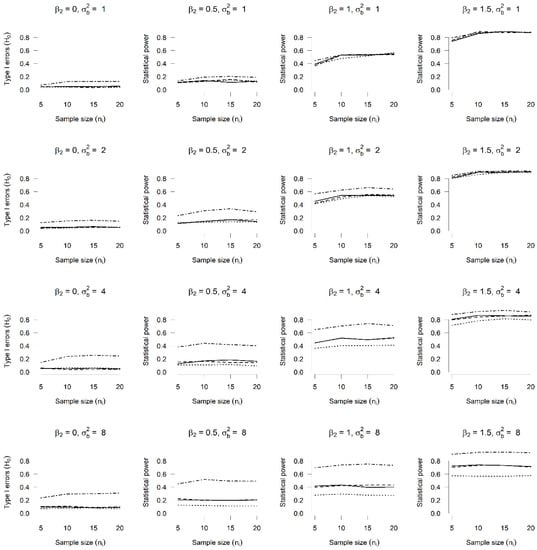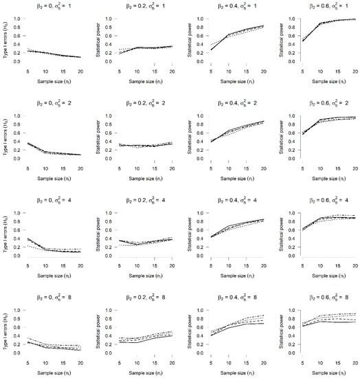 In the first column of Figure 3, we can observe the rejection rates for the null hypothesis when in fact, . In this case, we expect rejection rates around the significance level of 5%. For the random intercept with lognormal distribution (dash–dot line), we note that rejection rates are the greatest, thus indicating an impact of the incorrect specification of the distribution of the random intercept.