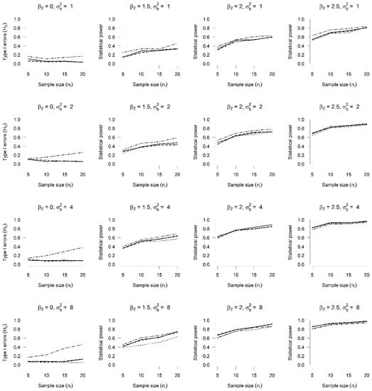As for generalized linear mixed models with a random intercept, the interest was focused on determining the ratio of times that an effect of the parameter of interest was detected; in this case, there are two: and ; i.e., where was rejected with a significance level of 5%, with this ratio corresponding to a type I error if and for other values of the parameter, this ratio represents the power of the analysis test [22], with . The values used for the parameters and are shown in Table 2. For the other parameters, the values of and were used.