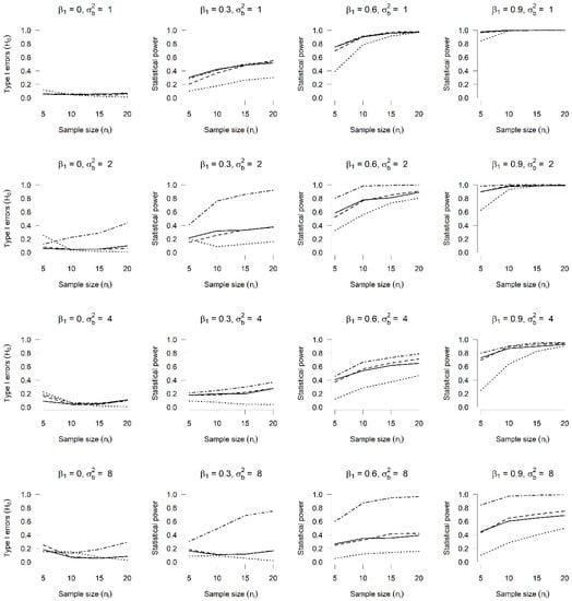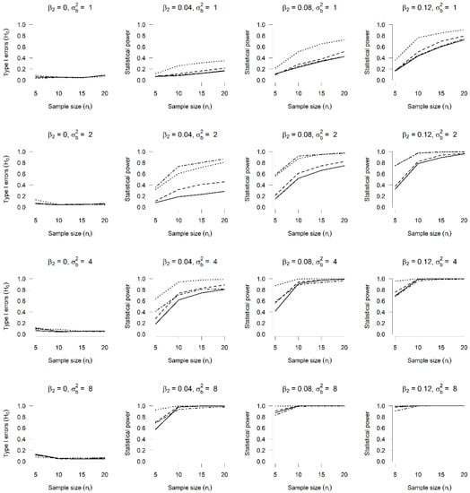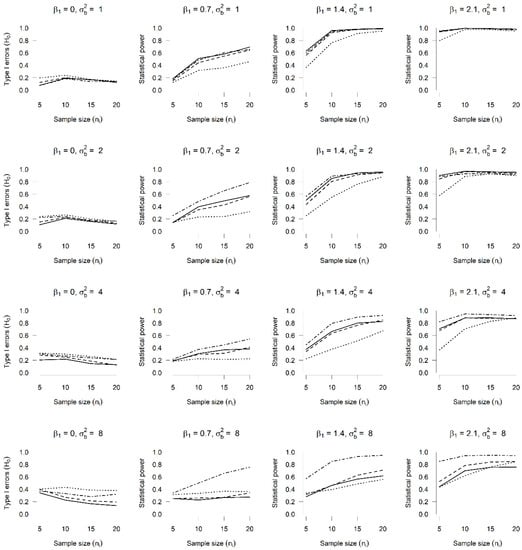 Figure 3 and Figure 4 show the results for type I errors and the power of the statistical Wald test when testing vs. in generalized linear mixed models with Poisson and NB response variables, respectively.