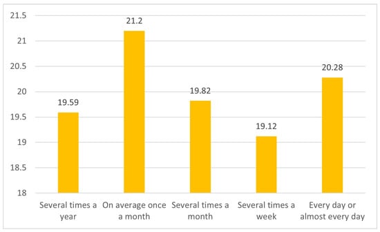 Patterns of honey consumption (n = 434, average on a scale: 0—not at all, 1—several times a year or less, 2—once a month on average, 3—5–8 times a month, 4—several times a week, 5—daily or almost daily).