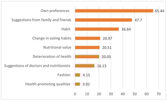 The main reason for honey consumption indicated by respondents was preference (65%). Almost half of those surveyed (48%) declared use of honey on advice from family members and friends. Another frequently given reason (37%) was habit. Less-important motivations for honey consumption were nutritional and health reasons such as the intention to change diet (21%), enhancing food’s nutritional value (20.5%), and deteriorating health (20%) (Figure 3). There was no statistically significant variation in the frequency with which individual reasons were indicated on account of the respondents’ demographic and economic characteristics.