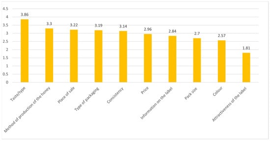 The most important factors in the respondents’ choice of honey were the type of the product (mean 3.9), the production method (3.3), and the place of purchase (3.2). Less-important factors determining their purchase of honey were the type of packaging (3.2), consistency (3.1), price (3), information on the label (2.8), and package size (2.7). The least-important factor determining the purchase of honey was the label attractiveness (1.8) (Figure 4).