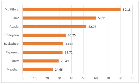 The nutritional and therapeutic properties of honey, along with its sensory appeal, should encourage its consumption, especially in highly developed countries where honey could play an important supporting role in combating the epidemic of civilisation diseases. However, according to FAO and Statista [,], it is developing countries that lead the way in honey consumption. For example, daily honey consumption in the USA is estimated at 1.8 g, in Europe, it averages 3–4 g, and in the Central African Republic 9.6 g. Pocol and Bolboaca [] attribute the decline in honey consumption in developed countries to its high-caloric content and high content of simple sugars, while suggesting a possible increase in consumption of this product due to growing interest in traditional foods. Chekol et al. [] found an increasing consumer interest in consuming organic honey, free from pestycicides and heavy-metal residues present in other types of honey [,]. Poland has many protected areas of high natural value where nectar is extracted for honey, which accounts for the high nutritional value of local products [].