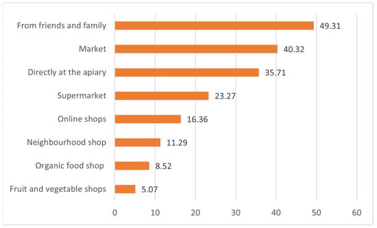 An analysis of how respondents acquire honey indicated that they acquire it most often from friends or family, and when buying, they are most likely doing so in a neighbourhood shop or directly in an apiary. Similar findings were made in other studies conducted in Poland [] and elsewhere [,].