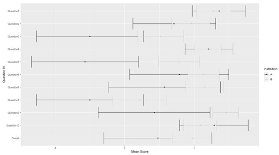 Participants from School B was more positive about endodontic training on VRDS, with statistically significant variation by in question responses by Institution (when controlling for variation between questions) (p ≤ 0.001). The findings are depicted in Figure 1.