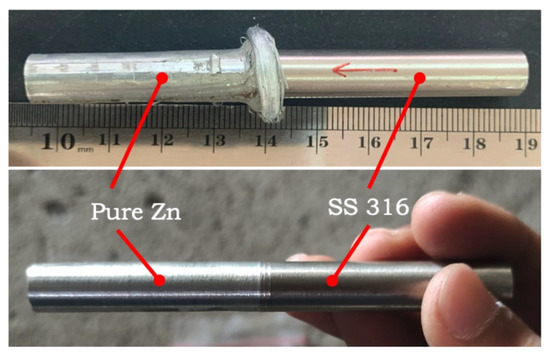So far, zinc has been used as an interlayer material to strengthen the attachment of friction stir welding between dissimilar materials, such as the interlayer between Cu and Al joints, whereby the assisted Zn interlayer improved the joint quality by regulating the interfacial microstructure [36,37,38]. Zn is also used as an interlayer for joints between Al and Steel, whereby the lap joints with zinc foil as a filler metal showed better strength than joints without a filler metal [39]. Friction welding has also been carried out to join Zn conductors [40]. However, the utilization of friction welding between Zn and other metals has yet to be known.