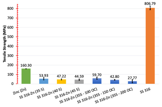 Tensile strength of SS 316-pure Zn joints rotary friction-welding (friction time of 35 s, 40 s, 45 s, 35 s—100 °C, 35 s—150 °C, and 35 s—200 °C, rotation speed at 1450 rpm, friction pressure at 3.9 MPa, and forging pressure at 6.9 MPa) with base metals.