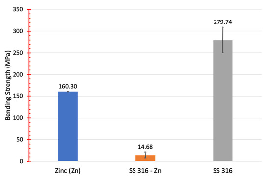 Bending strength of SS 316-pure Zn joints (friction time of 35 s) with base metals.