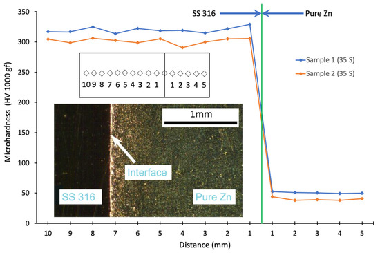 Hardness distribution across the weld of SS 316-pure Zn from two samples with friction time of 35 s.