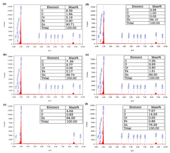 Spot analysis (EDS) at the fracture surface of tensile test results: (a) 35 s sample, (b) 40 s sample, (c) 45 s sample, (d) 35 s—100 °C sample, (e) 35 s—150 °C sample, and (f) 35 s—200 °C sample.