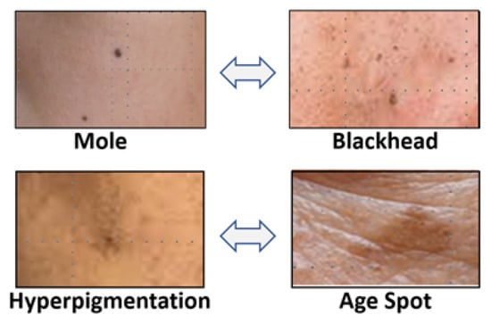 As discussed earlier, some facial skin problem types are not highly distinguishable; rather, they show some similarities. As an example, consider the instances of a mole, blackhead, hyperpigmentation, and age spot as shown in Figure 3.