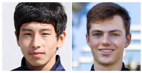 The left image shows a false detection of a winkle around hairs on the forehead and the right image shows a false detection of acne on the nose. This type of false detection could occur whenever a non-facial area contains shapes that are similar to the facial skin problem types.