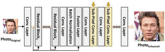 This tactic is to enhance the quality of small-sized object images, i.e., facial skin problem instances, by applying a Super-Resolution Generative Adversarial Network (SR-GAN) [45]. Generative Adversarial Network (GAN) consists of a generator network and a discriminator network to compete with each other to generate accurate predictions. GR-GAN is a GAN model that upscales and improves the quality of low-resolution images. That is, the structure of the Generator in GAN is enhanced with Sub-Pixel Convolution Layers as shown in Figure 7.