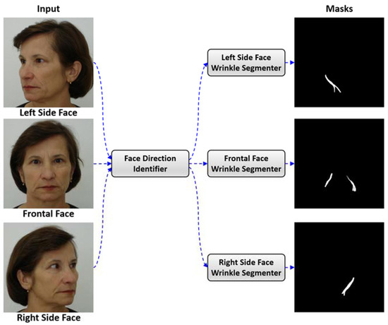 There have been a number of studies for diagnosing facial skin problems with deep neural networks. Shen’s study [1], Quattrini’s study [2], and Zhao’s study [3] explored the diagnosis of a specific facial skin problem, such as acne or rosacea, using CNN models. VGG-19 models were utilized in Shen’s work and Quattrini’s work. Liu’s study proposed a system for detecting moles [4] using UNet segmentation models.