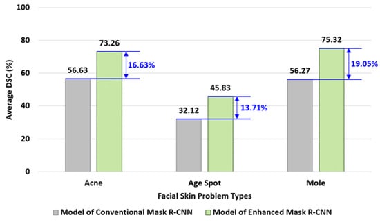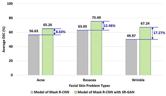 The hypothesis from this observation is that the detection of such small-sized facial skin problems with CNN models results in significantly low performance. To validate our hypothesis, CNN models using the Mask R-CNN algorithm [44] were trained to detect and visually segment 3 different types of objects. The model was trained with ResNet as the backbone, 0.001 for the learning rate, and (16, 32, 64, 128, 256) as the RPN anchor size. The performance of detection results using the Dice Similarity Coefficient (DSC) metric is shown in Table 3.