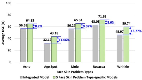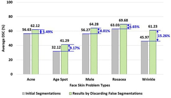 The performances of segmenting acne, age spots, moles, rosacea, and wrinkles were increased by 5.49%, 9.17%, 8.01%, 6.65%, and 15.26%, respectively, and the average of performance gains for all 5 types of facial skin problems is 8.92%.