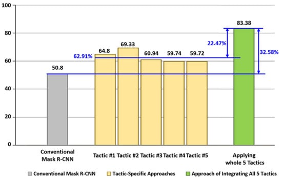 The integrated approach outperformed the conventional Mask R-CNN approach by 32.58%, and it outperformed the tactic-specific approach by an average of 22.47%.