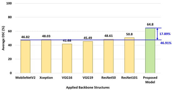 As shown in the figure, each of the segmentation models with MobileNetV2, Xception, VGG16, VGG19, ResNet50, and ResNet101 shows an average 46.91% of detection performance. It is 17.89% lower than the performance of our proposed model.
