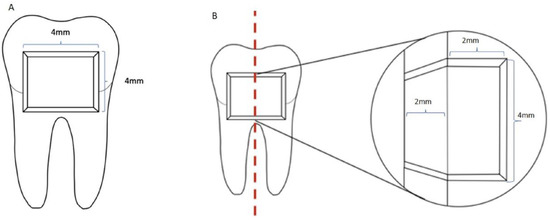 In each tooth, two class V cavities were prepared, one on the buccal side and one on the lingual/palatal side, with the coronal margin in enamel and the apical margin in dentin (1 mm apically from the dentinoenamel junction). The cavity proportions were as follows: 4 mm in length by 4 in width by 2 in depth (2 × 4 × 4). An ISO 835 diamond bur was used to perform the cavities, which was replaced after preparing five cavities. A schematic representation of the cavities view is shown in Figure 1A. Once the cavities were prepared, the teeth were sectioned longitudinally in a buccal/lingual–palatal direction with a diamond disc (ISO 806 104356524 220 Komet, Lemgo, Germany) until the cavity limit was reached, at which point they were separated by fracture by using a dental elevator (Figure 1B). In this way, two samples from each molar with two cavities each were obtained (n = 30 molar halves; n = 60 cavities).