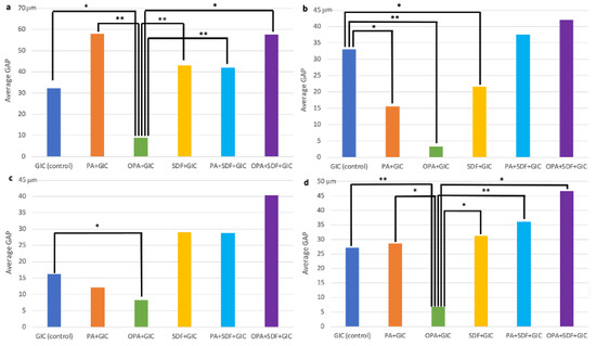 In Figure 3a, it can be observed that, in the coronal wall, the OPA + GIC subgroup showed a significantly lower interfacial gap than the rest of the subgroups. In the axial wall, the interfacial gap was significantly lower in subgroups in which dentin conditioning with PA or with OPA was used, and in the SDF/KI + GIC subgroup, than in the GIC subgroup (Figure 3b). In the cervical wall from the subgroup in which the dentin was conditioned with OPA, significantly less interfacial gap was found than in GIC subgroup (Figure 3c). Finally, when comparing the mean gap in all the walls, the OPA + GIC subgroup again showed lower gap values than the rest of the subgroups (Figure 3d).