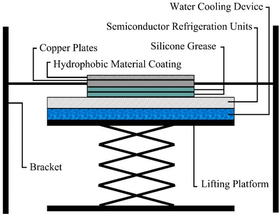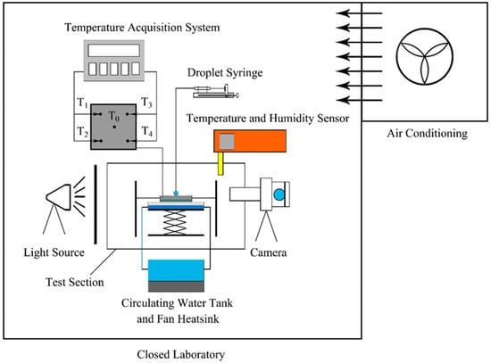 During the experiment, the closed laboratory was cooled by air conditioning to stabilize the room temperature at 16 °C. Temperature and humidity sensors were used to measure the temperature and humidity inside the test section. The copper plate was fixed on the test bench. The upper side of the copper plate was coated with hydrophobic material, and the lower side was coated with silicon grease to facilitate heat conduction. The semiconductor-cooling device and the water-cooling device were mounted on the lifting platform, and the surface of the semiconductor-cooling device was coated with a silicone coating. In the experiment, the circulating water tank and the fan radiator were always kept working to achieve the best cooling effect of the semiconductor cooling sheet. The syringe was connected to the capillary through a silica gel tube, and the droplet separated from the capillary after contacting the hydrophobic coating surface and remained on the coating surface. At that time, the initial contour shape and size parameters of the droplet could be measured by the ruler.