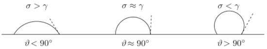 Three different cases in which the droplets rested on a flat, dry surface are shown in Figure 4. The droplets were set to the liquid phase. Ideally, the shape of a stationary droplet on a flat surface is determined by the surface tension of the droplet γ, the adhesion coefficient of the liquid–solid surface δ, the volume of the droplet V, and the contact angle of the surface θ.