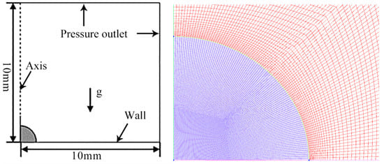 A physical model, as shown in Figure 5, was established based on the water droplet profile calculated by the Young–Laplace equation. Figure 6 shows the location and boundary conditions of the droplets in the computational domain on the left and the grid on the right. The left side is the rotational symmetry axis, the right and upper sides are the pressure outlet, and the lower side is the wall surface. Different cold surfaces can be obtained by setting the wall surface temperature, and the ambient temperature can be set according to the needs of the study. Water droplets and air are modeled separately, and both use structured grids. In this study, the process of the static freezing of droplets did not consider the change of shape, and there was an energy exchange between water droplets and air but no exchange of matter, so the surface of the water droplet was set as a solid wall.