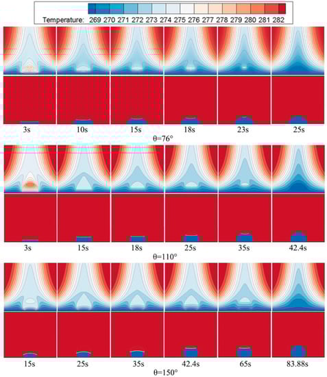 Figure 7 shows the temperature field changes and growth peak changes during the freezing process of the liquid droplets resting on the −5 °C plate surface with different contact angles, indicating that the ice peak surface was below the temperature cloud diagram. The red is the fluid region, and the blue is the solid region. The temperature of the droplet in contact with the wall gradually decreased, and the low-temperature region spread from the bottom of the droplet to the top of the droplet as the phase change solidification process progressed. The air temperature around the droplet also gradually decreased, and heat exchange occurred with the droplet. At the beginning, the temperature of the upper of the droplet is almost constant, and the temperature of the lower part of the freezing point droplet drops rapidly, with obvious temperature difference. This is because the upper part of the droplet is not in direct contact with the cold wall. The droplet then gradually cools, approaching the freezing point. In the middle stage of the droplet freezing, the internal temperature of the droplet was close to the freezing temperature, and the temperature changes gradually slowed down. As the freezing process progressed, the temperature gradually decreased. After the droplet was completely frozen, the temperature of the droplet slowly dropped to the wall temperature. After the droplet was frozen, the temperature dropped rapidly to the wall temperature due to the small specific heat capacity and high thermal conductivity of the ice.