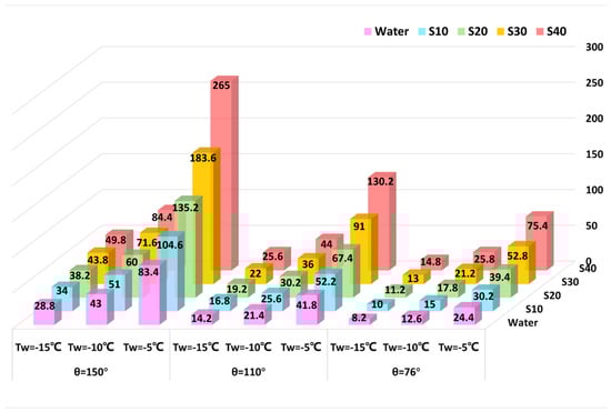 With different wall contact angles and different wall temperatures, the freezing times of the droplets changed with the changes in the droplet salinity, and the higher the droplet salinity, the longer the freezing process of the droplets. At a wall temperature of −5 °C, the freezing time increased by about 25% from pure water droplets to S = 10 at three contact angles. From the S = 10 saline droplets to the S = 20 saline droplets, the freezing time increased by about 30%. From the saline droplets of S = 20 to the saline droplets of S = 30, the freezing time increased by about 35%. From the saline droplets of S = 30 to the saline droplets of S = 40, the freezing time increased by about 45%. At a wall temperature of −10 °C, for every 10% increase in salinity at the three contact angles, the freezing time increased by about 20%. At a wall temperature of −15 °C, for every 10% increase in salinity at the three contact angles, the freezing time increased by about 15%.