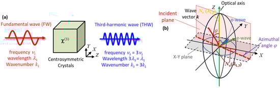 Figure 1a shows a brief schematic of the THG process in centrosymmetric crystal. The fundamental wave (FW) passes through the crystal and produces a third harmonic wave (THW) by three-order susceptibility χ(3). The produced third harmonic wave has three times the frequency (ν3 = 3ν1) and the wave number (k3 = 3k1) of the fundament wave. Its wavelength becomes one-third of the FW accordingly (λ3 = λ1/3). The angle dependence of THG is mainly related to the birefringence and dispersion of the crystal’s refractive index, which makes the light propagate at different speeds in different directions and wavelengths. Therefore, we introduce the refractive index first. For the common uniaxial crystal, Figure 1b gives the refractive index ellipsoid of the uniaxial crystal, where X-Y-Z is the Cartesian coordinates of the crystal, and the Z axis is assumed to be parallel to the optical axis. θ is the angle between the wave vector k and the optical axis. φ denotes the azimuthal angle, which is the angle between the projection of k in the X-Y plane and the X-axis. No and Ne are the length of the refractive ellipsoid. There are two different propagated waves in crystal, called the ordinary wave (o-wave) and the extraordinary wave (e-wave), of which the electrical fields are perpendicular and parallel to the incident plane, respectively. It should be noted that the effect of the walk-off is ignored in this paper. Thus, we assume that the e-wave is perpendicular to the k. The refractive index can be calculated by Equation (1), where the numbers 1 and 3 correspond to the FW and THW. We can see that the refractive index of the e-wave is dependent on the angle θ, and it is also related to the wavelength λ. Because the refractive index of the e-wave is determined by both θ and λ, the angle θ can be used for the compensation of refractive index dispersion between FW and THW. That is to say, the refractive index n3 of the third harmonic wave may be equal to that of the fundamental wave n1 by propagating at one special angle and choosing a suitable polarization combination, which is so-called birefringent phase-matching.