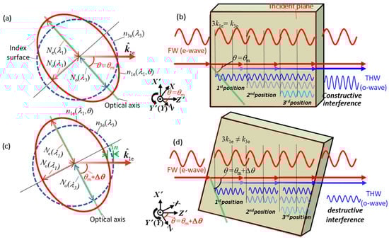Figure 2 illustrates the type I phase-matching of positive uniaxial crystal as an example. In this figure, FW and THW are assumed as e-wave and o-wave, respectively. X’-Y’-Z’ and X-Y-Z denote the stationary laboratory’s coordinate and the rotated crystal coordinate, respectively. The Z’ axis is parallel to the FW propagation direction 1e (laser direction) in crystal. Figure 2a shows the refractive index surface of the phase-matching case. We can see 1e is in the direction of phase-matching angle θm, which makes the phase mismatching ∆k(θm) = 6π/λ1(n3o − n1e(λ1, θm)) = 0 because of the refractive index difference ∆n(θm) = n3o − n1e(λ1, θm) = 0. In the phase-matching case, as given in Figure 2b, FW and THW have the same propagated speed in the crystal because ∆k = 0 and ∆n = 0. The THW generated in different positions (the first, second, and third, positions shown in Figure 2b) can be strengthened by constructive interference. Therefore, the detectable THG intensity is generated. However, as the crystal is rotated at an angle ∆θ away from the phase-matching angle θm shown in Figure 2c, d, the transmitted THG will be weakened because the generated THWs in different positions are reduced by the destructive interference where the ∆k(θm + ∆θ) and ∆n(θm + ∆θ) are not equal to zero. For the birefringent phase matching, there are three types for both the negative uniaxial crystal and the positive uniaxial crystal. Here, we only discuss the type I phase-matching of positive uniaxial crystal and the type II phase-matching of negative uniaxial crystal, taking into consideration that the high-efficiency THG in the centrosymmetric crystals has been demonstrated in the literature. The concept is similar in both the type I phase-matching of positive uniaxial crystal and the type II phase-matching of negative uniaxial crystal. The only difference is that the phase-matching angle θm should meet the condition of n1o + n1o + n1e(λ1, θm) = n3e(λ3, θm), and the incident fundamental wave should contain both the o-wave and the e-wave for the THG process. Combined with Equation (1) and the concept of phase-matching, the calculation of θm can be easily induced, and they are displayed in Equation (2) and Equation (3). Equation (2) is for the type I phase-matching, and Equation (3) is for the type II phase-matching. It should be noted that Equation (3) only shows an implicit relation, which should be solved by numerical methods.