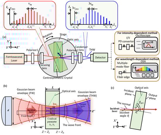As reported in our previous studies, there are two types of angle measurement methods based on the phase-matching principle of THG: the intensity-dependent method and the wavelength-dependent method. For the former, a single photodiode (PD) can be used as the detector (see Figure 3a), which converts the angle-related intensity change into an electrical current output. Then, the electrical current is amplified to a voltage by an I/V converter, and the voltage is displayed on an oscilloscope. The dispersion of angle dependence is very important because a single PD can only detect the total intensity ITHW of THW, which has a band from to . Therefore, the characteristics in the frequency domain cannot be measured. The angle dependence of measured total intensity ITHW(θ) can be evaluated by Equation (10) [].