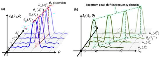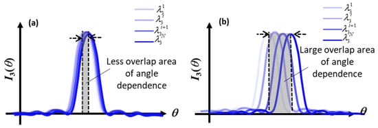 Figure 4 is used to visually explain the effect of dispersion. Supposing the angle dependence I3(θ) is dispersion-less in the wavelength band as shown in Figure 4a, there is a less overlap area of angle dependence between the modes of , , , and . That means there is also less possibility for the angle sensitivity to be reduced between the modes. A relatively stronger total intensity ITHW(θ) can then be expected because the summation of Equation (10) will be large. Conversely, as shown in Figure 4b, if the angle dependence is dispersive, the expected angle measurement sensitivity will be weakened because of the large overlap area of angle dependence.