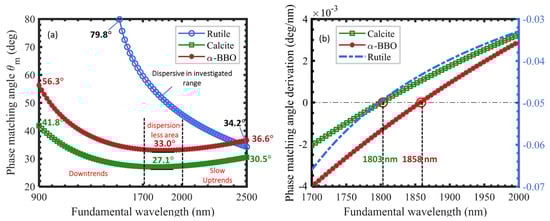 As illustrated before, the intensity-dependent and wavelength-dependent methods are based on the dispersion-less and dispersive properties of angle dependence. Here, we use the phase-matching angle θm(λ1) to denote the dispersion speed in a certain wavelength range because θm represents the angle of the highest point in the angle dependence curve. We first consider a wavelength range from 900 nm to 2500 nm, which covers a commonly used range of femtosecond laser, to find a suitable wavelength range for intensity-dependent angle measurement. The simulation results are given in Figure 6a, where the lines correspond to α-BBO, calcite, and rutile. In the investigated wavelength range, the θm(λ1) of rutile is monotonically decreasing from 79.8° to 34.2°, which indicates the angle dependence of rutile has a very significant dispersion in this range. Therefore, rutile is not an ideal crystal for intensity-dependent measurement in the investigated range. Compared with rutile, both the θm(λ1) curves of α-BBO and calcite go down firstly from 900 nm to around 1700 nm, then keep stable from 1700 nm to 2000 nm, and finally slowly rise from 1700 nm to 2000 nm. We can see that the trends of α-BBO and calcite are very similar, and the range 1700 nm to 2000 nm is the ideal range for intensity-dependent angle measurement because of the low dispersion. In the dispersion-less area, the θm(λ1) of α-BBO and calcite are around 33.0° and 27.1°. It is easy to understand that the derivative of θm(λ1) in the dispersion-less area should be close to zero. Figure 6b shows the calculated phase-matching angle derivative in a unit of deg/nm. In this figure, the α-BBO and calcite correspond to the left vertical axis. It can be seen that the dispersion speed of θm(λ1) is in the order of 10−3 deg/nm. Here, the red circles represent the positions having zero derivatives, which are 1803 nm and 1858 nm for calcite and α-BBO, respectively. As a comparison, the derivative result of rutile is also given in the figure. It corresponds to the right vertical axis. We see the dispersion speed of θm(λ1) is in the order of 10−2 deg/nm, which is much higher than the dispersion-less cases.