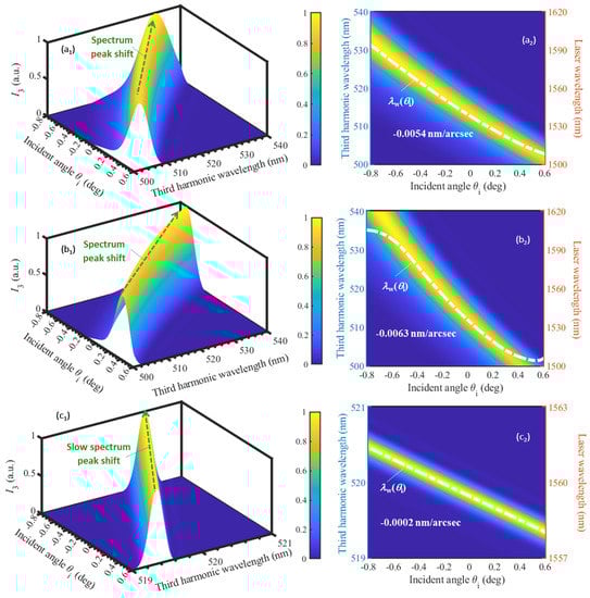 For the wavelength-dependent method, the spectrum peak shift can be found except for the dispersion-less area (1700–2000 nm) of α-BBO and calcite. In our previous work, a commercial femtosecond laser source was used for producing harmonic waves, and the central wavelength of the laser was around 1560 nm. Therefore, the wavelength-dependent method will be discussed near 1560 nm for future experimental work. In the simulation results, the parameters are the same as those of the intensity-dependent method. Figure 8 shows the calculated results for three crystals. In this figure, the letters a, b, and c correspond to the results of materials of α-BBO, calcite, and rutile, respectively. The numbers 1 and 2 correspond to the 3-D plot and 2-D plot third harmonic intensity I3, respectively. For each subplot, the color bar is used to indicate the amount of intensity. Here, we fixed the range from −0.8° to 0.6° to compare the peak shifts. The results in Figure 8(a1,b1,c1) show that the peak shifts exist for all the investigated materials, and all the peak shifts toward the longer wavelength in the frequency domain as θi decreases. The peak shifts of α-BBO and calcite both cover a range from around 500 nm to 540 nm. In contrast, the peak shift of rutile is relatively slow because it even cannot cover the wavelength range from 519 nm to 521 nm. The essence of peak shift is the point movement, which makes ∆n(λ1, θ) = const. This movement can be described by a contour map of ∆n(λ1, θ). It has been analyzed in our previous work on SHG. Therefore, it is not repeated here because of the similarity. The weighted wavelengths λw(θi) are shown in Figure 8(a2,b2,c2) by the white dotted lines to quantitatively evaluate peak shifts. The sensitivity is calculated by a linear fitting function to get the slope of λw(θi). The calculated sensitivities are −0.0054 nm/arcsec, −0.0063 nm/arcsec, and −0.0002 a.u./arcsec for α-BBO, calcite, and rutile, respectively. The results suggest that α-BBO and calcite have better measurement performance in the wavelength around 1560 nm.