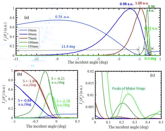 We also give a qualitative explanation of the results of Figure 9a. It can be seen from Equation (4) to Equation (8) that the angle dependence I3(θi) is related to both the beam waist w1 and the confocal parameter b1. As the focal length f decreases, both the beam waist w1 and the confocal parameter b1 are reduced in Equations (7) and (8). On the one hand, as in Equation (4), the decrease of w1 makes the I3 increase directly. On the other hand, the decrease of confocal parameter b1 will make the |J3|2 change because J3 is related to the term 1/(1 + 2iz/b1). After a Taylor expansion of 1/(1 + 2iz/b1), |J3|2 has the following form as shown in Equation (14),