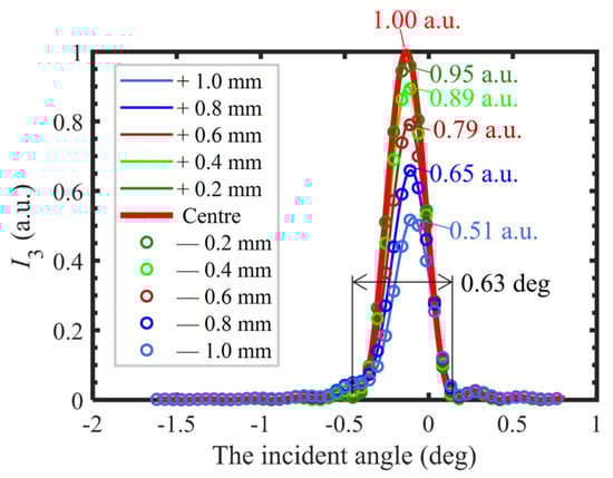 In the optimized case of f = 100 mm, the effect of the beam waist position is considered in Figure 10. Lines and circles are used to denote the beam waist positions of ±0.2 mm, ±0.4 mm, ±0.6 mm, ±0.8 mm, and ±1 mm relative to the crystal center. The maximum intensity is obtained in the center of the crystal at 1.00 a.u., which can be seen in the red line. This is because the central position makes the high-intensity area of the Gaussian beam to be fully used for the THG process. As the beam waist gradually moves away, the peak intensity falls from 0.95 a.u. (±0.2 mm) to 0.51 a.u. (±1 mm). The symmetric results for the positive/negative beam waist movements are the consequence of the Gaussian beam’s symmetric shape. In addition, the angle dependence areas of I3 are both close to 0.63 deg, as shown in the figure. Thus, the best measurement sensitivity should be obtained when the beam waist is in the center associated with the highest intensity.