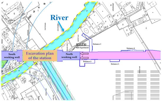 In the actual excavation conditions of the Guiqiao Road subway station, the corresponding weak soil needs to be excavated inside the maintenance structure of the pipe curtain, and the stability of the soil in front of the excavation has an important influence on the construction safety, so it is important to analyze and ensure its stability for the construction safety. During the construction of this project, the excavation plan of the station is shown in Figure 1.
