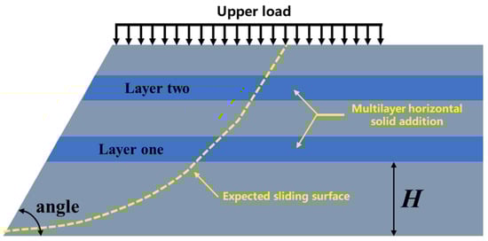 Under the excavation condition of this project, because the surrounding pipe curtain has a better supporting effect on the soil, the surrounding pipe curtain is simplified as a fixed boundary; that is, the soil at the palm face will not be deformed on both sides of the tunnel but only in the tunnel longitudinal deformation, because in the excavation process, the soil at the upper part of the palm face also needs to play a supporting role for the upper part of the pipe curtain, so the role of the pipe curtain on the palm face is simplified. Therefore, the effect of the pipe screen on the palm face is simplified to a uniform load acting on the soil in front of the palm face. In summary, the excavated soil in front of the palm face can be simplified and analyzed as a horizontally reinforced slope system with the upper part acting as a load, and the corresponding form is shown in Figure 2.