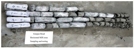 As shown in Figure 2, the slope reinforcement is carried out by the MJS (metro jet system) method, which is also known as the omni-directional, high-pressure jetting method. Based on the traditional high-pressure jet grouting process, the MJS method adopts a unique multi-hole pipe and front-end causing device, which realizes the mandatory slurry discharge in the holes and the monitoring of the in-ground pressure and adjusts the amount of mandatory slurry discharge to control the in-ground pressure so as to make the deep slurry discharge and so that the in-ground pressure is reasonably controlled. The MJS method is widely used in soft soil reinforcement, and the stabilization of internal pressure during construction reduces the impact of the MJS rotary pile construction on the surrounding strata and structures, which is especially suitable for excavation and reinforcement in urban underground space. After sampling of the MJS reinforcement, it can be seen that the extracted core samples are in the form of columns, the overall mixing of core samples is more uniform, the cement cementation degree with the soil is better, the cement content of the core samples is high, the pile body is complete and its own strength is higher, and the internal friction angle and cohesion of the soil body are obviously improved after reinforcement, which shows that the MJS method of reinforcement has achieved a good result in the soft soil stratum. The MJS method hydraulic soil core samples are shown in Figure 3.